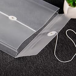 [Perfect Size for Documents]: Holds standard 8.5" x 11" paper with room to spare! Our clear plastic envelopes measure 9.6" x 13"x 1.2", making them ideal for reports, worksheets, and manuals. The ultimate plastic envelope for documents in school, office, or home. [Secure String & Button Closure]: These clear envelopes keep contents safe with a tight-sealing tie-string and snap button. No more spills or lost papers—perfect for organizing and transporting documents. [Heavy-Duty & Reusable]: Made of tear-resistant translucent poly plastic, these plastic file folders withstand daily use. Waterproof design protects papers from spills, rain, or accidents. [Expandable Storage]: Gusseted sides expand up to 1.2 inches for extra capacity. Store bulky documents, contracts, or projects without bending or damage. [10-Pack Value Set]: Get 10 high-quality clear envelopes in one cost-effective pack. Reuse them for years—great for teachers, students, and professionals!