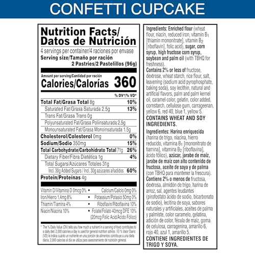 Pop-Tarts Frosted Confetti Cupcake toaster pastries are a delicious treat to look forward to any time of day. Includes one, 13.5-ounce box of Frosted Confetti Cupcake toaster pastries. Jump-start your day with a bakery-inspired, vanilla cupcake-flavored center encased in a pastry crust and topped with yummy confetti sprinkles. A quick anytime snack for the whole family, Pop-Tarts are an ideal companion for lunchboxes and on-the-go moments; Not just for breakfast, the versatile deliciousness of Pop-Tarts fits into your lifestyle just about anywhere there's time for a snack. Store them in your desk drawer for a pick-me-up at the office, keep them on hand in your pantry for a sweet after-dinner treat, or bring some in the car for a satisfying snack on the road. These toaster pastries make welcome additions to care packages, goodie bags, and gift baskets. Just pop them in your toaster for a crisp, warm crust, heat them in the microwave, or enjoy them right out of the pouch with a glass of ice-cold milk.