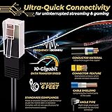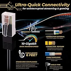 Future-Proof Speed - This cable provides exceptional transmission performance and low signal losses; Supports up to 500 MHz and is suitable for Fast Ethernet, Gigabit Ethernet, and 10-Gbps Ethernet; Downward compatible with preceding Ethernet standards such as Cat5 and Cat5e 90 Degree Right Angle Down �� This straight to right angle network cable with downward modular connector offers a clutter-free solution when connecting network devices in compact and cramp spaces such as in the back of furniture or in a network closet; No more force-bending any straight patch cable which could lead to damaging the cable or affecting the data transmitting speed High Performance Quality - Made out of 4 unshielded twisted pair (UTP) of ultra thick oxygen-free copper core, molded strain-relief boots, corrosion resistance and gold-plated contacts provide better immunity from crosstalk, maximize conductivity and minimize noises and signal interferences that can degrade the signal quality; Insure high signal quality over long distance transmission High Bandwidth Applications �� The bandwidth up to 500 MHz ensures secure high-speed data transfer for server applications, cloud computing, video surveillance and online high definition Full HD 1080P 4K UHD Ultra HD video streaming, online gaming, etc Universal Compatibility - Cat6 8P8C modular 26AWG RJ45 connector cable provides universal connectivity for LAN network components such as PCs, computer servers, modems, printers, routers, switch boxes, TV box, network media players, NAS, VoIP phones, PoE devices, and more; Meets or exceeds Category 6 performance in compliance with the TIA/EIA 568-C.2 standard and UL 444 specifications