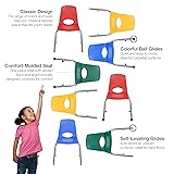 KIDS' CHAIR SET: set of 6 sturdy stacking classroom chairs in assorted colors: 2 blue, 2 red, 1 yellow and 1 green COLORFUL BALL GLIDES: spherical plastic glidesallow chairs to move easily and quietly about the room COMFORTABLE SEAT: one-piece molded seat shell with a vented back and screwless, no-snag design STACKABLE DESIGN: chairs come fully assembled, stacks safely up to 6 high to help save space after class or during activities BUILT TO LAST: meets or exceeds BIFMA standards for safety, durability and structural adequacy in furniture; holds up to 225 lbs SAFE FOR YOUR SPACE: GREENGUARD Gold Certified for limited emissions into indoor air CHAIR DIMENSIONS: each chair measures 17.3" L x 17.3" W x 28" H, 5.9 lbs; recommended for ages 8 to 12 years