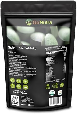 Go Nutra - Spirulina Tablets, Organic Spirulina, Packed with Vitamins, Minerals, Fibers, Amino Acids, and More, All-Natural Spirulina Supplement, Non-GMO, Vegan, 500 mg, 720 Tablets