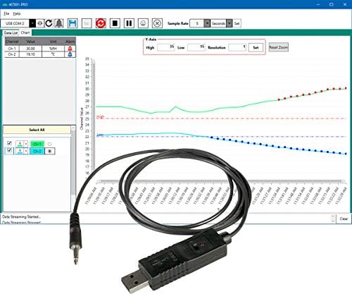 Convert specific Extech meters to a datalogger. The 407001-PRO software allows user to live stream data from compatible meters to a PC based computer/laptop while storing the collected data for later use in generating a graph or report. The data can be viewed as a list or on a chart and can be saved as a CSV or TXT formatted file and exported to a Notepad or Excel®. For products that have multi-channels, user can color code each channel. It also has a user programmable High/Low alarms that will display red (above) or blue (below) dots when readings exceed set points on the graph.