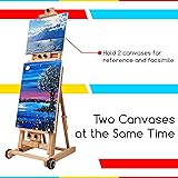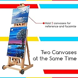 This is a versatile solid beech Studio h-frame easel, total height adjustable from 59" (150cm) to 95" (240cm) while tilting in vertical, holding canvas art up to 77" (196cm) Versatile studio easel is made of finely handcrafted of smooth, sanded beechwood, Made for artists who think and work big Studio easel has two front large rolling wheels so that moving the easel and locking it into place is effortless. Adjustable-height & angle mast contains three sliders that freely adjust to the size of the canvas to meet your painting needs Its wide stance and broad foundation make it the easel of choice for the serious artist who works on a giant scale. Go Deluxe if your canvases are wide as well as tall Hand crafted in a light clear coat, deluxe yet functional the large artist studio easel, pictorial instruction and tools included to assemble, satisfaction guarantee, no doubt trying this versatile easel by MEEDEN. Assembling Video included.