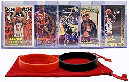Dennis Rodman is one of the most popular players in the NBA! This lot of five 1986-2000 basketball cards makes a great gift and collectors item for any Rodman, Bulls, or Spurs fan. All cards are in near mint to mint condition and are shipped with each card in its own individual soft sleeve and top loader or semi-rigid sleeve. Comes with bonus gift bag and two wristbands in team colors, making it the perfect gift for the young fan. WRISTBANDS AND GIFT BAG INCLUDED ARE UNBRANDED GIFT ITEMS AND DO NOT CONTAIN ANY RODMAN, BULLS, SPURS, OR NBA RELATED BRANDING, LOGOS, OR TEXT.