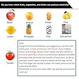 Package Includes: 4 pieces copper sheet, 4 pieces zinc sheet,1 piece Electronic clock,2 pieces RGB LED,4 pieces Wire, 2 pieces wires with clip, 1 piece English assembly instructions Easy to operate: you only need to prepare fruits, vegetables or drinks to assemble a battery to work with led or electronic watches, such as: apples, oranges, potatoes, lemons, tomatoes, cola, pears, pineapples, or salt solutions, etc. By completing the Fruit battery Science Experiment Project with student, let student experience the mystery of science, develop theirs imagination and hands-on ability, and make them more interested in scientific experiments. Read the instructions carefully before building the project to avoid damage to the electronic watch or to prevent the LED from working. Fruit selection:we suggest you use fruit with more juice, tomato will be your first choice, if you choose lemon and orange, please insert copper and zinc tablets in the same petal flesh (there is a membrane between the different petals that will hinder the transfer of electrons), as far as possible, insert copper and zinc tablets all the way into the fruit.The LED lighting effect is more visible in dim environments.