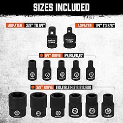 Includes Socket Storage Snap on Rail for Easy Storage.Each socket has permanent high visibility laser etched size markings for quick size selection during operation. Constructed of heat-treated chrome vanadium steel for strength and durability. This impact socket set meets ANSI performance standards. 6 pc 1/4" Drive Sockets E4, E5, E6, E7, E8 and 1/4 to 3/4 impact adapter 7 pc 3/8" Drive Sockets E10, E12, E14, E16, E18, E20 and 3/8 to 1/4 impact adapter. 2 pc impact-grade adapter and reducer kit includes 1/4"(F) to 3/8"(M) - 3/8"(F) to 1/4"(M).