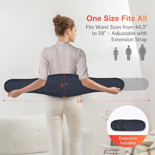 - Flexível para todos - Esta almofada de aquecimento para dor nas costas é flexível, com um cinto ajustável que pode estender até 58 polegadas para se ajustar a todos os tamanhos. Assim, pode ser apreciada por homens e mulheres de todas as formas e tamanhos. É um ótimo presente de bem-estar para homens, mulheres, para aniversário, Dia das Mães ou Dia dos Pais. O tamanho máximo do cinto é de 58 polegadas, o tamanho mínimo é de 44,3 polegadas;