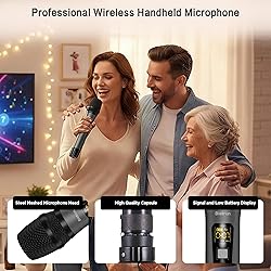 Long Distance Wireless Karaoke Microphone: Wireless Distance Upgrade To 160 Feet (50m), Upgraded the microphone manufacturing process with Signal Stability●No Delay●No Radiation●Anti-Howling●Anti-Jamming ●Constant Frequency●Distortion <0.2%●15 Uhf Adjustable Channels. ●The Mic Outer Case Is Alloy Material Which Is Harder, Lighter And More Wear-Resistant. Plug And Play, Easy To Use: ●Can Only Plug In equipment with Mic input, Can't Plug In AUX input, Otherwise No Sound.(Not Compatible with Bluetooth Speakers and Laptop)●For With Mic input Speaker, Singing Machine, Audio Amplifier, Pa System, Mixer, Voice Amplifier And More Streaming Multimedia Equipment..●The Display Can Show The Battery Power And Signal Strength In Real Time, Don'T Worry About Suddenly Not Working. Microphone Battery Powered and Rechargeable Receiver: The Microphone Does Not Come With Any Batteries, We Recommend Using 2 AA Amazon Alkaline Batteries. ●Correctly install the battery + - direction.●the receiver should be charged for 5 hours before the first use●Long Press and hold the Mic and Receiver buttons to power on, The Chargeable Receiver Is Built-In 650 Mah Battery For 4 Hours work Time And Fully Charged In 3 Hours. Unidirectional Microphone: Built-In Professional Moving-Coil Unidirectional microphone core, when uses, the mouth should be close to the top of the microphone to loud voice for Conference, Speech, Outdoor, Church, Family Party, Open Ceremony, Dancing Instructor, Promotion, Etc.●If You Use Multiple Mic At The Same Time or Noise, Please Switch Channels(Open the mic battery cover, click the“HI LO”button), Make sure each mic channel number is different and the channel numbers are far apart. Quick Troubleshooting: ●1.Make sure you have enough power for the mic and receiver. ●2.Connecting equipment with MIC input, not other interfaces. ●3.If you find no sound from the mic, you need to re-pair.1.Turn off the receiver and mic.2. Open the mic battery cap.3. Press and hold the mic(HI LO)button for 10s+ until the display channel flashes.4. Quick turn on receiver, wait for the mic channel display to stop flashing, and the blue light of the receiver is always on, ready to use.