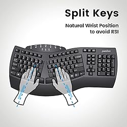 Split-Key Ergonomic Design: One-piece split layout separates keys into left and right zones to reduce wrist bending and support a natural hand position. Dimensions: 19.1 × 9.3 × 1.97 in; Weight: 2.26 lb. Ideal for long typing sessions. Dual Wireless Connection: Switch between 2.4 GHz nano receiver and Bluetooth. Nano receiver stores safely in the keyboard compartment. Plug-and-play setup requires no drivers or software. Requires 2 × AA alkaline batteries (not included). Dual OS Compatibility: Works with Windows and Mac, including shortcuts and function keys. Easily switch systems via the bottom switch. Four additional Mac/Windows keys included with key puller for customization. Long Key Travel & Tactile Feedback: Extended key travel delivers responsive, tactile feedback similar to brown mechanical switches. Durable construction rated for up to 20 million keystrokes. Curved Rows & Ergonomic Keycaps: Stepped, curved key rows promote natural typing posture. Curved keycaps with flatter tops and back edges fit fingertips for comfort. Made from ABS with 4.2 mm membrane key travel. Natural Learning Curve: Ergonomic shape may require a short adjustment period. Most users adapt within 1–2 weeks and experience improved comfort and reduced wrist pressure. Multiple Layouts & Laser Printing Options: Standard US layout included. Additional layouts available with minimum order (20 pcs), including German, French, Italian, Spanish, UK, Japanese, Korean, Nordic, Hebrew, Arabic, and more. Wide Compatibility & Warranty: Compatible with Windows 7, 8, 10, 11. Package includes keyboard, receiver, 4 extra keys, key puller, and manual. Backed by a 12-month limited warranty via the Perixx website.