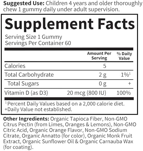 Garden of Life Kids Organic Vitamin D3 Gummies with 800 IU (100% Daily Value) for Strong Bones, Teeth, Brain & Immunity – Non-GMO, No Gluten, Vegetarian, Sugar Free, Orange Flavor, 60 Servings