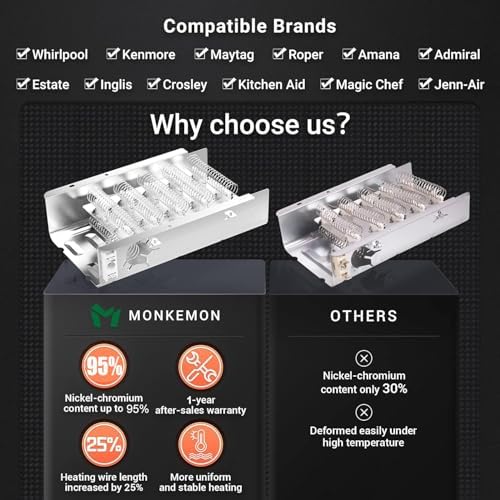 - Upgrade Quality:Monkemon heating element performs excellently in heat-proof and abrasion-proof with its NICKEL-CHROMIUM content up to 95%. The heating wire is 25% longer than other ordinary dryer replacement parts. More uniform heating & no damage to clothes.Meet OEM manufacturing standards.