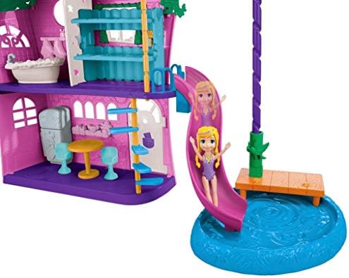 - Desde la cubierta superior de Lil' Lake House, la muñeca Polly de 3 pulgadas puede deslizarse por el poste hacia el lago y chapotear o también puede ir al tobogán desde el segundo piso. También puede nadar en el lago con su tubo flotante, toalla y bebidas para relajarse.