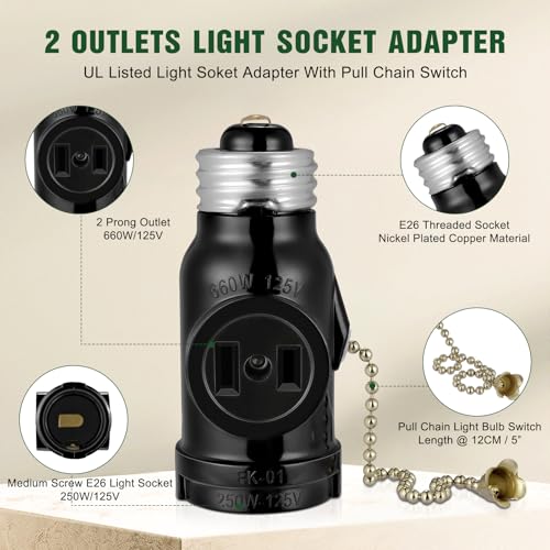 2 Outlet Light Socket Adapter,E26 Bulb Socket to Outlet Splitter,Converts Medium Screw Socket into a Socket with Two outlets,Polarized Outlet,with Pull Chain Switch. UL Listed, Black (1-Pack)