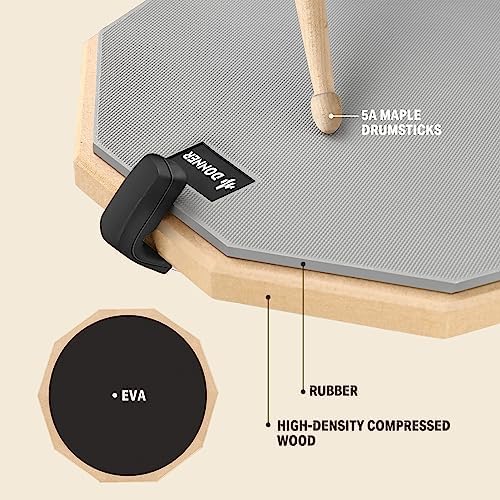 - 【Noiseless and Enduring】The surface of the 12'' Double-Sided drum practice pad adopts high density and elastic rubber, offering the drummer the feel of real drum hitting, and the bottom is made of EVA polymer mat plus high-density compressed wood board, stronger sound insulation, and providing a stable base for practice
