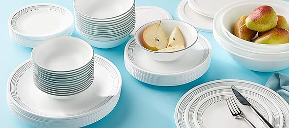 78-PIECE SET: Includes (12) 10-1/4-inch dinner plates, (12) 8-1/2-inch salad plates, (12) 6-3/4-inch appetizer plates, (12) 18-oz soup/cereal bowls with lids, (12) 10-oz dessert bowls, (2) 2-qrt serving bowls, and (2) 1-qrt serving bowl with lid. LIGHT AND STRONG: Say goodbye to chips and cracks with Corelle's triple-layer-strong glass plates and bowls. This durable plate set is lightweight, easy to handle, and allows for compact stacking, which takes half the space of ceramic dishes. LOW MAINTENANCE: This dinnerware set is designed to provide the best dining experience while requiring low maintenance. It's ultra-hygienic, non-porous and easy to clean. Plates are dishwasher safe and microwave safe. CLASSIC STYLE: Add some style to your eating experience, and make your dinnerware the topic of conversation. This set comes with elegant soft-gray borders meant to bring you and your loved ones together for an amazing culinary experience. LIMITED WARRANTY: This item has a 3-year limited warranty. TIMELESS BEAUTY: Crafted with pride in Corning, New York, Corelle Dinnerware are a staple of modern eating for everyday occasions, filling hearts and tables since 1970.