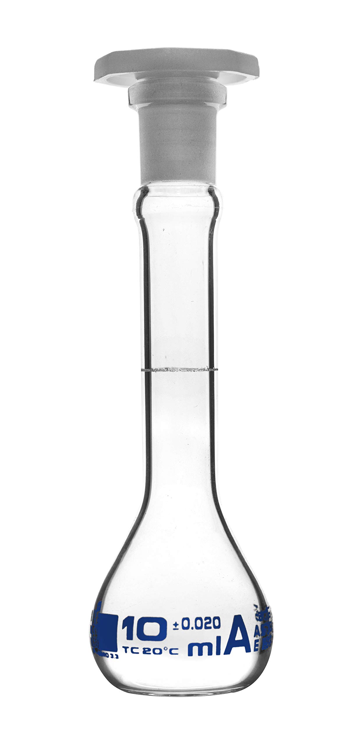 EISCO Volumetric Flask, 10ml - Class A, ASTM - Tolerance ±0.02ml - Polypropylene Stopper - Single, White Graduation - Borosilicate Glass