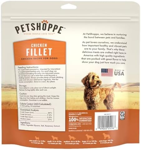 As pet lovers ourselves, we understand how important a healthy and vibrant dog is to your family. That's why we take the time to slow-dry only lean, USA Chicken Breast for our PetShoppe Premium Chicken Fillet Treats. This time-intensive process retains the natural flavors and nutrients of the chicken, thus eliminating the need for artificial colors, flavor, or preservatives. Crafted right here in America, these delicious treats are packed with great flavor and protein that will help show your dog just how much you care. Made in the USA Made with USA chicken as the #1 ingredient No corn, wheat, or soy Grain free No artificial colors or flavors No animal byproducts or added fats 100% satisfaction guaranteed Feeding Guidelines: For supervised consumption. Intended for intermittent or supplemental feeding only. For small dogs, we recommend breaking the jerky into bite size pieces. Do not feed your pet a treat that could become a choking hazard. Always provide plenty of fresh drinking water and visit your veterinarian regularly. Not for human consumption. Store in a cool, dry place. Size Lbs # of treats per day Extra Small 3 to 12 1/2-1 Small 13 to 25 1-2 Medium 26 to 50 2-4 Large 51 to 100 4-5 Extra Large 100+ 5-6