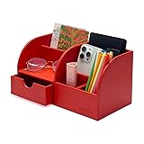 UnionBasic Desk Organizer - Multifunctional Leather Desktop Pen Holder Storage Box - Business Card/Pen/Pencil/Mobile Phone/Stationery Holder, Red