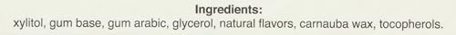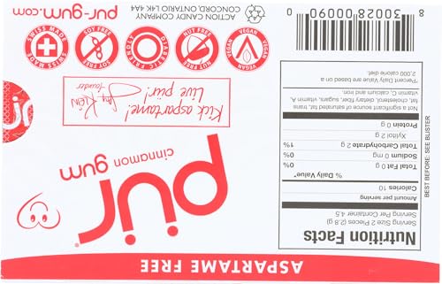 Pur cinnamon gum provides the fresh feeling every mouth deserves with 100% xylitol and absolutely no aspartame or added sugars. Each piece in our pack of 9 includes xylitol, gum base, gum arabic, glycerol, natural flavors, carnauba wax and tocopherols and is free of peanuts, peanut oil, soy, soybeans and tree nuts.