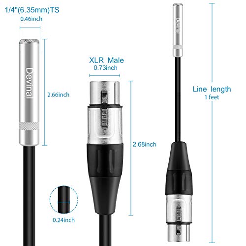 Devinal XLR hembra a cable de 1/4" hembra, adaptador de conector de audio XLR Jack a 6.35mm TS/TRS de 1 pie (30 cm) de construcción metálica
