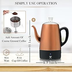 Electric Percolator: 10 Cup Copper Percolator Coffee Pot Electric, Stainless Steel Coffee Percolator Electric With Keep Warm Function, Classic Perculator Pot With Removable Basket for Home or Office Essential Accessory: Electric 10 cups percolator includes removable coffee filter basket, pump tube & easy-pour spout for smooth serving. Pour slowly to avoid drips, PC knob, Hand wash to preserve finish Stylish Design: This electric percolator coffee pot features a stainless steel body and cool-touch handle for safe pouring. Indicator light signals readiness; keep-warm function holds ideal temp Electric Coffee Pot Dimensions: Compact size 11"H x 9"L x 5.7"W fits kitchen counters, coffee stations & breakrooms. 24" removable power cord. The coffee percolator pot heats up to 170°F. Generous brew capacity Giftable Electric Coffee Maker: Built for durability and everyday use. The electric coffee percolators are a great present for Christmas, holidays, birthdays, Mother's Day or housewarmings.