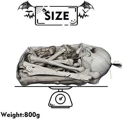 - Mesh Bag of Bone Decoration: Hollow plastic life size skeleton bones includes two full sets of leg bones, ribs, two each of hands and feet, one coccyx, one partial spine piece, a skull with flexible jaw, backbone vertebrates.