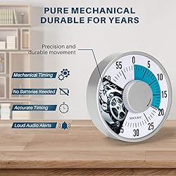 - How to use? STEP 1 - Wind-up the timer by turning the control knob clockwise until the colored disc reaches 55-minute for EVERY TIME use. STEP 2 - Turn the control knob counterclockwise-from 55-minute to set the desired count down time. Item Features: Large enough to see from far distance, even for the old aged. Easy to see. The red wedge offers an easy reading of how much time is left Magnetic back, so you can put it anywhere with metal. Total mechanical. You will never have to worry about replacing batteries! Max Time up to: 60 Minutes. There is a gentle ticking sound that lets one know the timer is working. It has a short, but alarming ring that gets your attention when the time is up. You can use it for getting ready for school, for completing homework, baking, cooking or for chores. Specification: Product Size: 6. 3" x 6. 3" x 1. 77" : 2 years