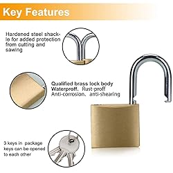 MATERIAL - Solid brass padlock body is strong and stylish,and make the lock highly durable SECURITY - Keyed alike padlock. Hardened steel shackle for superior cut resistance,use keyway design for added security and 5-pin cylinder helps prevent picking EASY TO USE - This brass padlock is easy to install and hand. One lock with 3 same keys, easy to open USAGE - Wide range of general security applications best used for backpacks, duffel bags, sports bags, briefcases, computer bags, cabinets and tackle boxes,etc. PROTECTION SYSTEM - Dual Lever locking mechanism and rust free internal mechanism for increased security