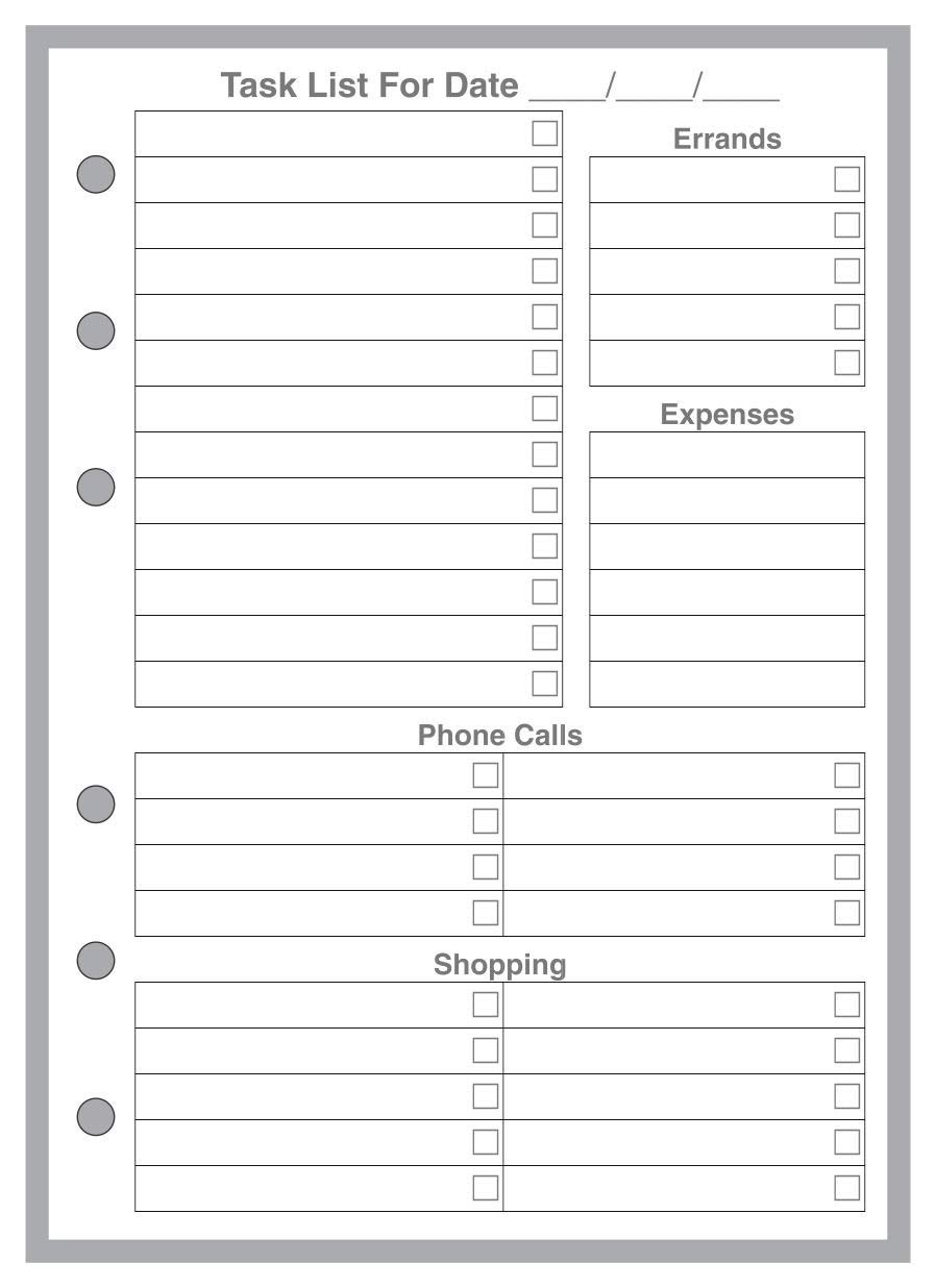 An essential Daily Task Planner for A6 size notebook users. Each page provides space for daily to-do’s, errands to run, phone calls, and shopping. Each item has a handy check box for completion. There is also a place for daily expenses. The back provides space for notes and important daily thoughts. Produced by Handy Forms for your A6 size notebook.