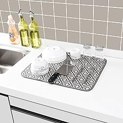 - Stylish Rhombic Microfiber Dish Drying Mat Strong Water Absorption: It has 4 times of water absorption. Catches drip under bowls, dish rack, cutlery, cups, pans, and more on it. Keep countertop clean. Elegant Style: Elegant style fits any color theme of the kitchen. DESCRIPTION: Package Including: 2 * Dish Drying Mat Material: Microfiber Dimension: 19.2*15.8 inch NOTES: 1. Do not use the dryer to dry it; Please wash it once a week. Machine washable, and you'll be able to use your dish drying mat again and again! 2. For long-term usage time, please clean it in time, if it gets dirty.
