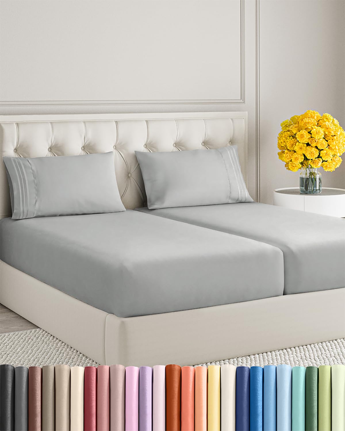 - CGK Unlimited 5-Piece Split King Size Sheet Set with Deep Pockets. Many Split King sheet sets are made of low-quality bedding fabric that tears easily and feels rough and uncomfortable against the skin. Our CGK Unlimited Split King size fitted sheet & flat sheet set uses super-fine, double brushed microfiber fabric which means that our Split King sheets luxury bedding feel softer than 1,000, 1500, and 1800 thread count sheets. Our tightly woven 5-piece sheet set ensures softness coupled with extra strength and durability. Plus, breathable, brushed microfiber products are a great option. CGK Unlimited’s 5-Piece Sheet Package Includes: 1 Flat Sheet (108” x 102”) 2 Fitted Sheets (39” x 80”) 2 Cooling, Silky Pillowcases (20” x 40”). Perfect Fit. While many deep pocket sheets Split King are ill-fitting and can be a struggle to get on the bed, our Split King fitted sheets have deep pockets to easily fit mattresses up to 16 inches, so making the bed takes half the time. Fits comfortably over mattress toppers and air mattresses, too! Features: Deep Pockets to Fit Mattresses 16” Deep, Premium 100% Brushed Microfiber Fabric, Luxuriously, Buttery Soft, Breathable, Cooling, Machine Washable, Easy Cleaning, Resistant to Tearing, Shrinking and Fading! At CGK Unlimited, we love giving the gift of deep, luxurious sleep. We have high standards for our bed sheet set, and work hard to uphold those standards and keep you happy and well-rested. Our hotel quality, ultra soft sheet set Split King will leave you sleeping deeply. Best for any room in your house - bedroom, guest room, kids' room, RV, vacation home. Great sheet and pillowcase sets for kids, boys, girls, teens, men, and women.