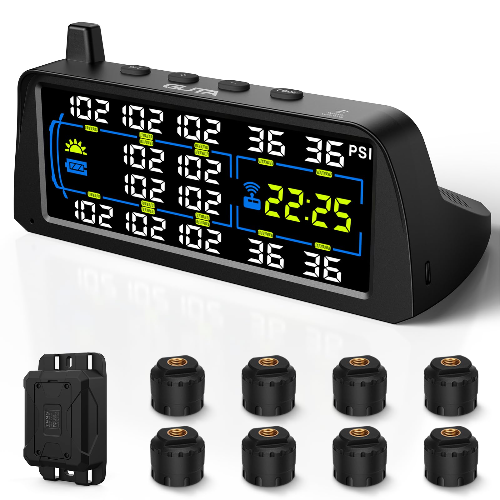 - REAL TIME MONITORING FOR 4-6 TIRES: Real-time monitoring the temperature and pressure with high degree accuracy for 4-6 tires simultaneously and can automatically change the corresponding data, LCD display mode ensure the high resolution ratio and guarantee the high-definition and no splash screen condition.