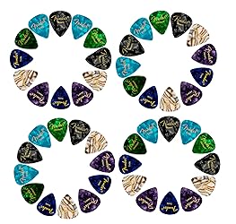 - The Fender Premium Picks Sampler - 48 Pack delivers the legendary tone and feel trusted by guitarists for decades, crafted from premium celluloid for a smooth striking surface, traditional response, and warm, rounded tone. Featuring the iconic and most popular 351 shape with a wider body and rounded tip, these picks offer exceptional comfort, control, and versatility for strumming, precise picking, riffs, and lead playing across electric, acoustic, and bass guitars. This multi-color sampler includes a full range of gauges - Thin (.46mm), Medium (.71mm), and Heavy (.97mm), making it easy to identify and experiment with different thicknesses to find the perfect balance of flexibility, attack, and control. With consistent professional-grade performance and classic Fender quality, this 48-pack is an essential accessory for beginners exploring their sound and seasoned musicians refining their setup.