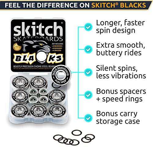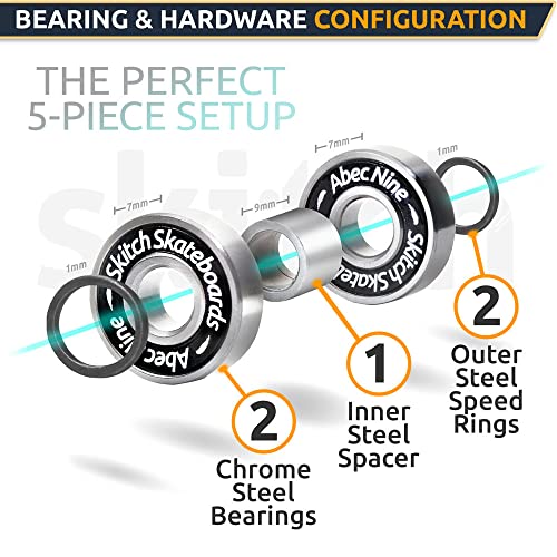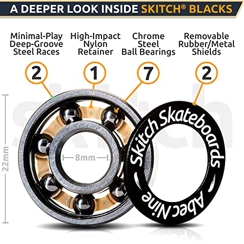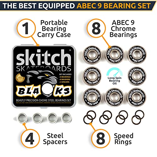 - ✅ FEEL THE DIFFERENCE ON SKITCH - Our precision ABEC 9 chrome steel skateboard bearings out-perform ABEC 7 bearings and will have you out-spinning and out-lasting the best ceramic, titanium and swiss bearing brands.