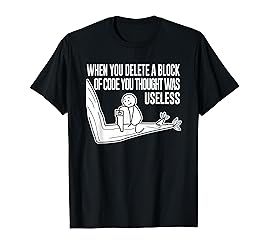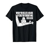 Design says When You Delete A Block Of Code You Thought Was Useless. Great meme design gift for any nerds, geeks, computer lovers, computer science major, computer science graduate, engineer, data nerd. Geek out with this amazing design! Funny coding design for a computer programmer, debuggers, computer science major, geek, nerd, gamer, software engineer or coder. Great for those that do programming languages like HTML, Java, C, C++, C#, PHP, Phyton, Ruby, Javascript and SQL. Lightweight, Classic fit, Double-needle sleeve and bottom hem