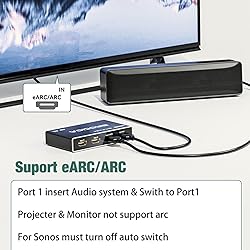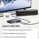 HDMI Switch with ARC Support – Switch to PORT1 : Connect your soundbar to hdmi switch Port1. Auto/Manual Switch for HDMI Switch 3 in 1 out : Press and hold 3s to toggle auto-switch (enabled by default). 3 Port 4K 60Hz Hdmi Selector - HDCP 2.3 : Supports 4K@60Hz, 1440P@120Hz, 1080P@240Hz and more. Total cable length <12ft for 4K@60Hz. 4K Hdmi Switcher – Supports HDR & Surround Formats : Works with HDR10+, Dolby Vision, ALLM, VRR. Audio: Dolby Atmos, DTS:X, LPCM, etc. Compatible with Multiple Devices for HDMI Multi : Works with PS5/ PS4 / XBOX SERIESX/ XBOX ONE S/ FIRE TV/ APPLE TV/ BLUE RAY and more. Hdmi Splitter 3 In 1 Out with remote control : Easily connect 3 HDMI devices to one display—eliminates the hassle of constant cable swapping. Aluminum Shell, Cool & Efficient for HDMI Switch Box : Low power (15mA@5V) for stable, long-term use. Handy Remote Included - 3 Port HDMI Switch : Compact, easy to use — works up to 22ft within a 60° angle. Stylish Design for 4K HDMI Switch : Acrylic glass panel with sleek black-and-white finish. Online Knowledge Base for Pro Hdmi Switcher : Covers compatibility tips and troubleshooting support.
