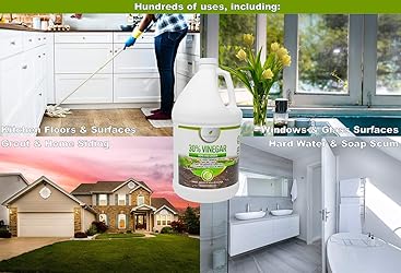 ✅ 6x stronger than store bought vinegar, industrial-strength solution for indoor or outdoor usage. Use to replace many harmful & toxic chemicals. ✅ Biodegradable product, Highly concentrated formula: This vinegar is a powerful cleaning agent that can tackle tough stains and grime. It can be diluted with water to adjust the strength for different cleaning tasks. ✅ Excellent for removing hard water deposits, cleaning rust from tools, cleaning soap scum, removing carpet and upholstery stains & cleaning grout. ✅ Great for lowering PH of soil/water, cleaning coffee machines, cleaning and freshening garbage disposals & preventing bright clothes from fading. ✅ Also can be used to unclog faucets and shower heads, clean masonry and brick patios or clean and shine your windows. 30% vinegar has 100's of uses!