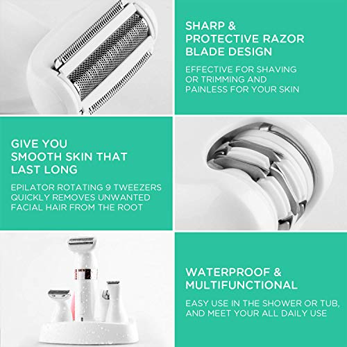 - MULTIFUNCTIONAL BODY GROOMER - With 5 functional heads, three shaving heads for different contours, one thoughtful mini epilator head for facial hairs, one cute silicone facial cleansing. And extra bikini trimming comb attachment is included. Freely choose the different function heads ensure that you have the right one for any grooming needs.