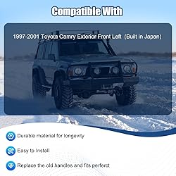 Outside front driver side door handle replacement - Silver color (NOTE: pls compare your original parts with your new parts to make sure this is the right one you need) Outer door handles replacement for 1997 1998 1999 2000 2001 Toyota Camry CE, LE, XLE Made from high quality material, easy installation and perfect fit Replace OE Part Number: 79426, 6922033040, 69220-33040, 6922033040C0, 6922033040-C0, 69220-33040-C0 6922033041C0, 6922033041-C0, 69220-33041-C0 [Customer Service] -2-Year-Warranty. Please feel free to contact our customer service team for any concerns or problems