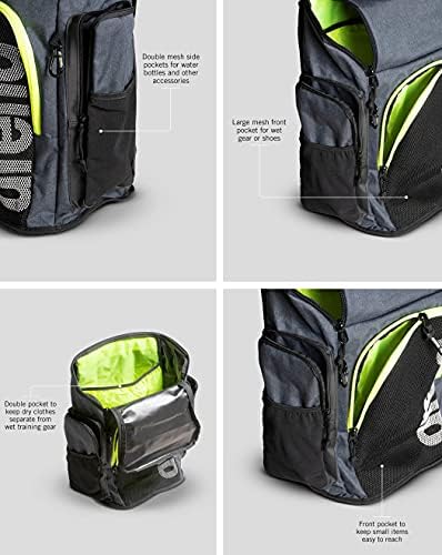 The team 45 backpack has a larger main compartment with multiple exterior compartments to carry all your training gear. So stuff your swimwear, workout clothes, caps, goggles, keys, phone, water bottles into the convenient main compartment or side vented pockets for easy stow options. Equipped with a mesh/ventilated front zip compartment for moisture control, wide-mouth top zipper main compartment and 2 side mesh compartments with elastic cinch closure for gripping your favorite pre/post workout drink container or stashing your wet swimwear. With a total of 45 liters (2746 cu In) Of storage space, This bag is the only one you need for carrying your swim & dry-land training needs to the pool or gym. We engineered this backpack for easy quick gear loading with the pack's wide-mouth top YKK zipper compartment. Oversized and robust YKK zippers on each compartment provide ultimate security for your gear. With both interior and exterior compartments for separated dry and wet storage keeping moisture under control.