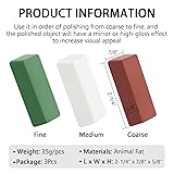 【Function】These Buffing Polishing Compounds Kit great for achieve a smooth and mirror finish on a widely variety items surfaces, help you handle most kinds of projects. 【Application】These jewelry polishing compounds are Idea for metals polishing buffing, such as: stainless steel, steel, iron, aluminum alloy, brass, bronze, copper, silver, gold etc. 【How to Use】The jewelers rouge polishing compounds are designed to be applied on buffing wheels by simply turning a buffing wheel on a grinder/motor/drill and lightly press the compound against the wheel while the heat/friction will transfer the compound onto the polishing wheel. 【Grits Combo】These polishing rouge bars are color coded for easy identification in a scale from coarse to super fine, Red is coarse, White is fine, Green is super fine. 【Dimension】L x W x H: 2-3/8” x 7/8” x 5/8”. Weight: 35g/pcs. Materials: Aluminum Oxide. Package: 3Pack.