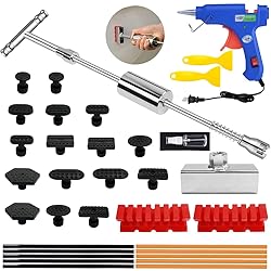 Pro Design - Principle of leverage to design the slide hammer dent puller is ergonomic, efficient and labor. Works with hot melt glue to pull the dents out. (This dent repair kit is come with glue gun and glue sticks, There is a switch on the handle of the glue gun, which needs to be turned on and preheated for 5-8 minutes before the glue flowing out can be used.) Paintless Repair - The T-bar dent puller is made of tempered high-carbon stainless steel and standard stainless steel. In the parts of the body contact with high-quality rubber precision package, can avoid damage to the original paint. Widely used - Dent puller kit is suitable for most of big dents. Efficient action on automobile and other metal surface dents. (The applicable temperature for glue sticks ranges from 0 to 40degrees. If the temperature dropped below 0 degree, the hot melt glue mayquickly curdle and cannot be sticked. For this case, just heat the joint with a hairdryer before use this product.) For DIY - Dent removal tool is coming with detailed repair steps introduction for operating, it makes the dent removal process easily. Our car dent puller can help you repair dents quickly by yourself for many times. (Tips: This dent repair tool kit can effectively repair 90% of the repair effect, but not repair 100% of the perfect effect. Please read the instructions carefully before buying.) Customer Service - Please read the product description and manual carefully before use. Contact us through Amazon for any questions, We will help you solve your issues. (Note: Please do not trust any third-party information to avoid being deceived, We only service through Amazon.)