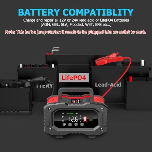 - [Cargador de batería de plomo-ácido LiFePO4 de 20A] 12V 20 Amp, 24V 10Amp Cargador de batería rápido de 7 etapas, Diseñado para cargar, mantener y reparar todas las baterías automotrices, LiFePO4, marinas y de ciclo profundo de 12 voltios y 24 voltios incluyendo AGM, GEL, EFB, SLA, Inundado (HÚMEDO), Calcio en coches, camiones, SUV, ATV, motocicleta, motonieve, cortacésped, barco, tractor, montacargas, carrito de golf, etc. que es mucho más rápido que los cargadores automáticos de 10A o 6A.