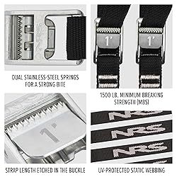 🛡️ Reliable – NRS Strap is strong, easy, fast and simple with unlimited usefulness. 💪 Strong, Sturdy Hold – Custom cam buckles with dual stainless-steel springs for a strong, even bite that won't slip, ever. Featuring tight woven webbing won't stretch when wet. ✔ UV-Resistant – Polypropylene webbing resists sun damage. Twist the strap when not flush against a surface to reduce wind vibration and minimize edge wear. 👓 Easy to Read – The strap size is prominently indicated on the buckle so there's never any guesswork. A woven name tag near the buckle lets you reclaim your straps from friends who borrow but don't return. 🛶 Secure Belongings Confidently – Designed for transporting boats and fastening gear, these deliver an impressive Minimum Breaking Strength (MBS) of 1,500 lbs.