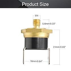 - Thermostat Temperature Control Switch,Adjust Snap Disc Temperature Switch 145°C Copper M4 Normally Closed Specifications: Product Name:Bimetal Thermostat,Temperature Control Switch Model: KSD301 Material: Bakelite Reset Method: Automatic Series: KSD301 copper head with thread Thread specification: Temperature:145°C Package Contents: 1Pcs X Thermostat Features: 1. Normally Closed: The original state of temperature control switch contact is closed,and open when the temperature sensing exceeds the rated temperature. 2. Feature: Contact sensor,speed dynamic type, sensitive, reliable, safe, stable action temperature,long service life,no arc phenomenon. 3. Advantage: General purpose,automatic reset,low cost,large capacity,minute current thermostats. 4. Application: Mainly used for motor electric heating, bottles, cabinet, coffee shell, electric iron,dryer,air conditioning, heater, electronic cooker, heater, cupboard and motor cleaner etc.