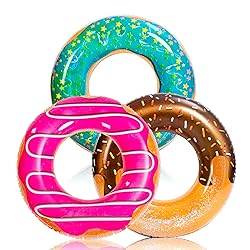 - Pack of 3 Inflatable Donut Pool Tubes include one Strawberry Dream Donut Tube, one Chocolate Glaze Donut Tube, one Sparkle Mint Donut Tube Inflated size for the rings is 32.5 inches, Great for Adults & Kids Great Pool Float, Pool Toys, Party Supply for kids Seasonal merriment, summer pool parties decorations Made of high quality vinyl, thicker material delivery better quality and more durable than any other products in the market Bright and Sparkle your summer to add more fun! The Glitters inside will reflect light and sparkle in the sunshine so your tubes looks great