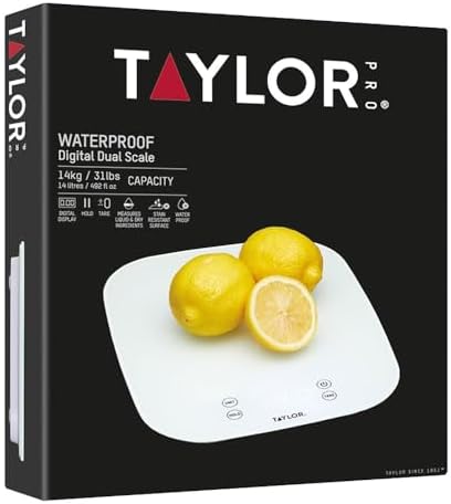 Taylor Pro Digital Kitchen Food Scales, Compact Professional Standard with Precision Accuracy and Waterproof Design with Tare Feature, White Glass, Weighs 14 kg/14 L Capacity