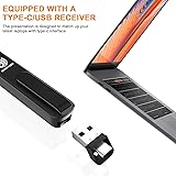 PowerPoint clicker Remote: Equipped with USB and TYPE-C receiver, wireless control distance up to 10m. A red laser pointer that's easy to see against most backgrounds, highlight key areas of your slides, so you can free to move around the room to interact with your audience. User-friendly Design: Separate Buttons with obviously contours are easy to click. Silicone buttons support the intensity of induction, accurate response, brings you comfortable touch feeling with the laser pointer for presentations. More Functions: Support hyperlink(only for Office). It also combines Page Up, Page Down, Full Screen, Black Screen, Volume Up/Down for PowerPoint clicker with laser pointer Easy to Use: The mini USB receiver supports plug and play technology. No driver is required. Built-in docking bay stores receiver, easy to carry and storage, simply plug in the receiver to start your power point clicker wireless presentation Widely Compatible: This Clickers presentation remote suitable for Windows 7/8/10, Windows 2003, XP, Vista, Mac OS, Linux, Android and PowerPoint, Keynote and Prezi softwares