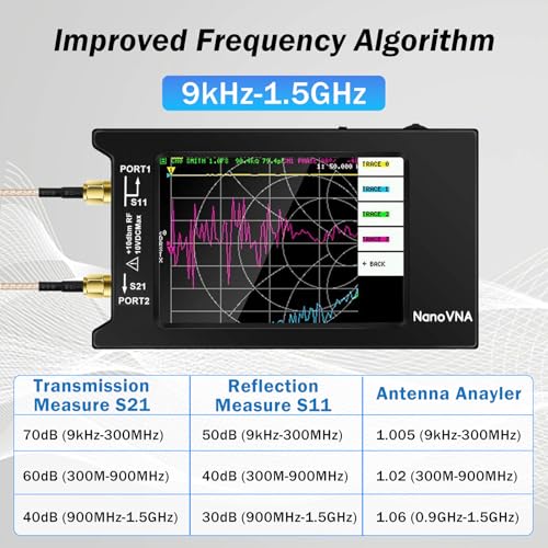 - [ALGORITMO DE FRECUENCIA MEJORADO] El algoritmo de frecuencia mejorado del nano vna h4 puede usar la extensión armónica impar de si5351 para soportar frecuencias de medición hasta 1.5GHz. El rango de frecuencia de 50K-300MHz de la salida directa si5351 proporciona mejor de 70dB de dinámica. La banda extendida de 300M-900MHz proporciona mejor de 60dB de dinámica, y la banda de 900M-1.5GHz es mejor de 40dB de dinámica. Úselo para revisar nuevas instalaciones de cables o antenas y para ajustar rutinariamente el sintonizador RF para una óptima