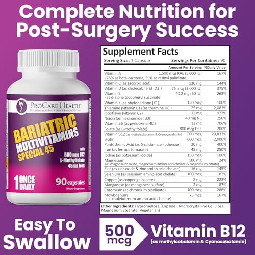 - Fast-Dissolving & Stomach-Friendly: Pro care health bariatric multivitamin with 45 mg iron vegetable-based capsule designs for health multivitamin Free from sugar, gluten, and GMOs, after bariatric surgery must haves capsules gentle on your stomach.